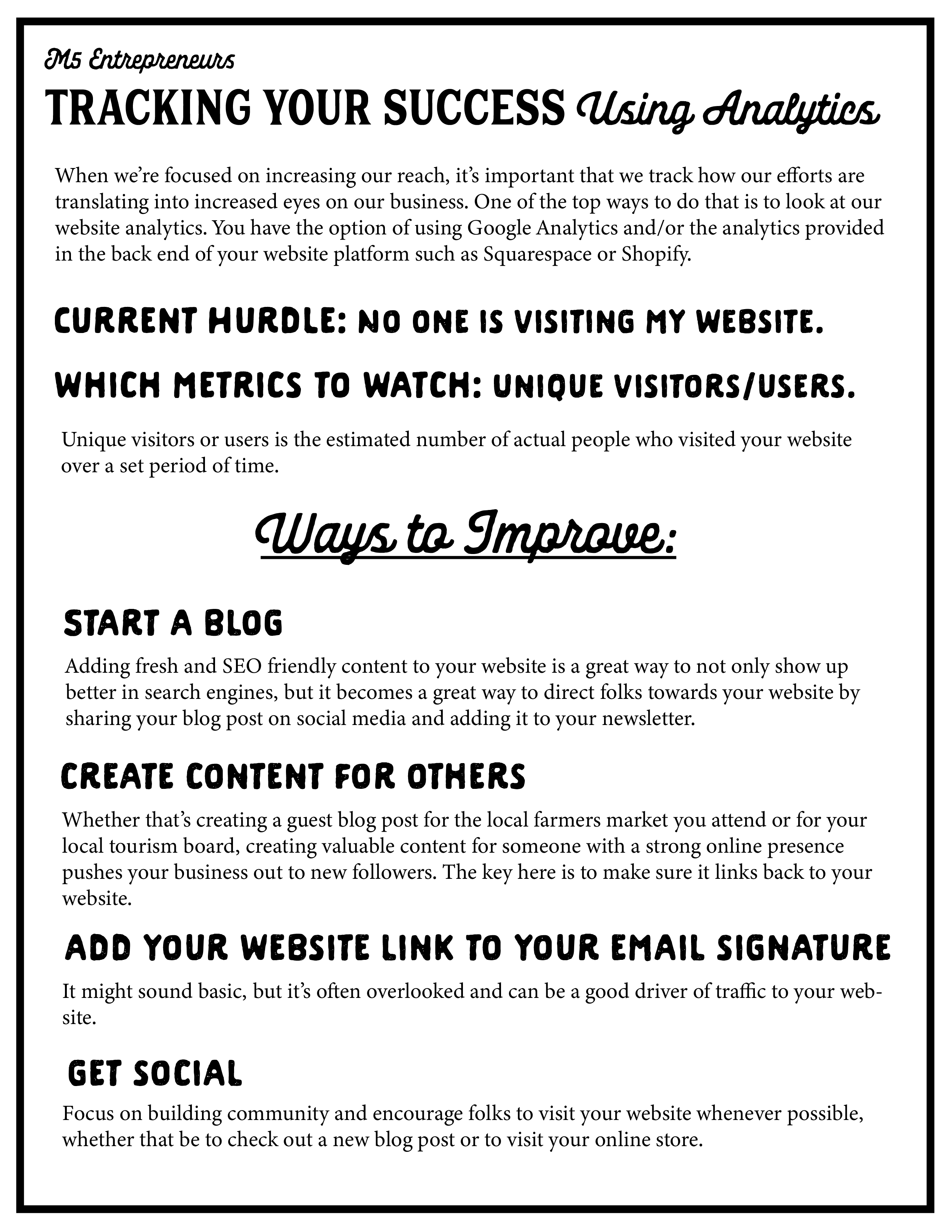 When we’re focused on increasing our reach, it’s important that we track how our efforts are translating into increased eyes on our business. One of the top ways to do that is to look at our website analytics. You have the option of using Google Analytics and/or the analytics provided in the back end of your website platform, such as Squarespace or Shopify.